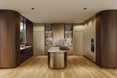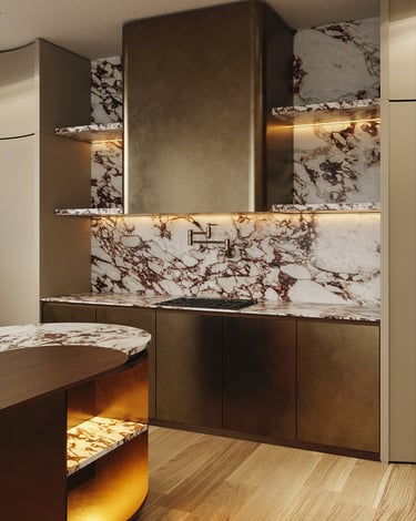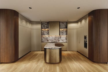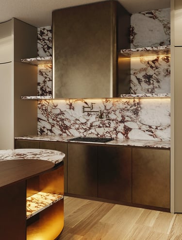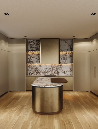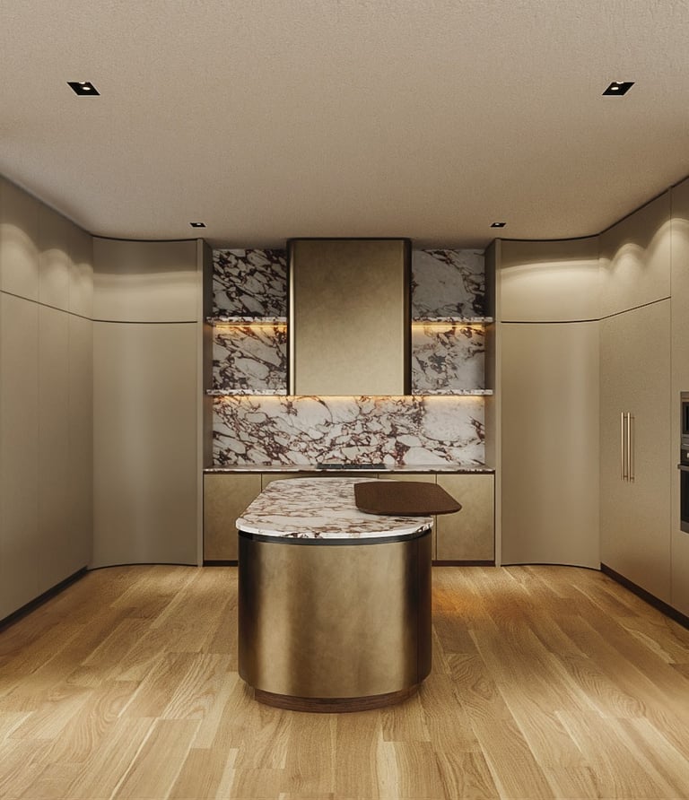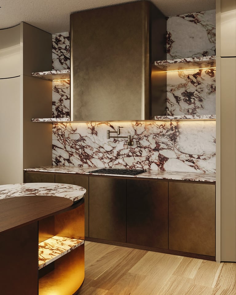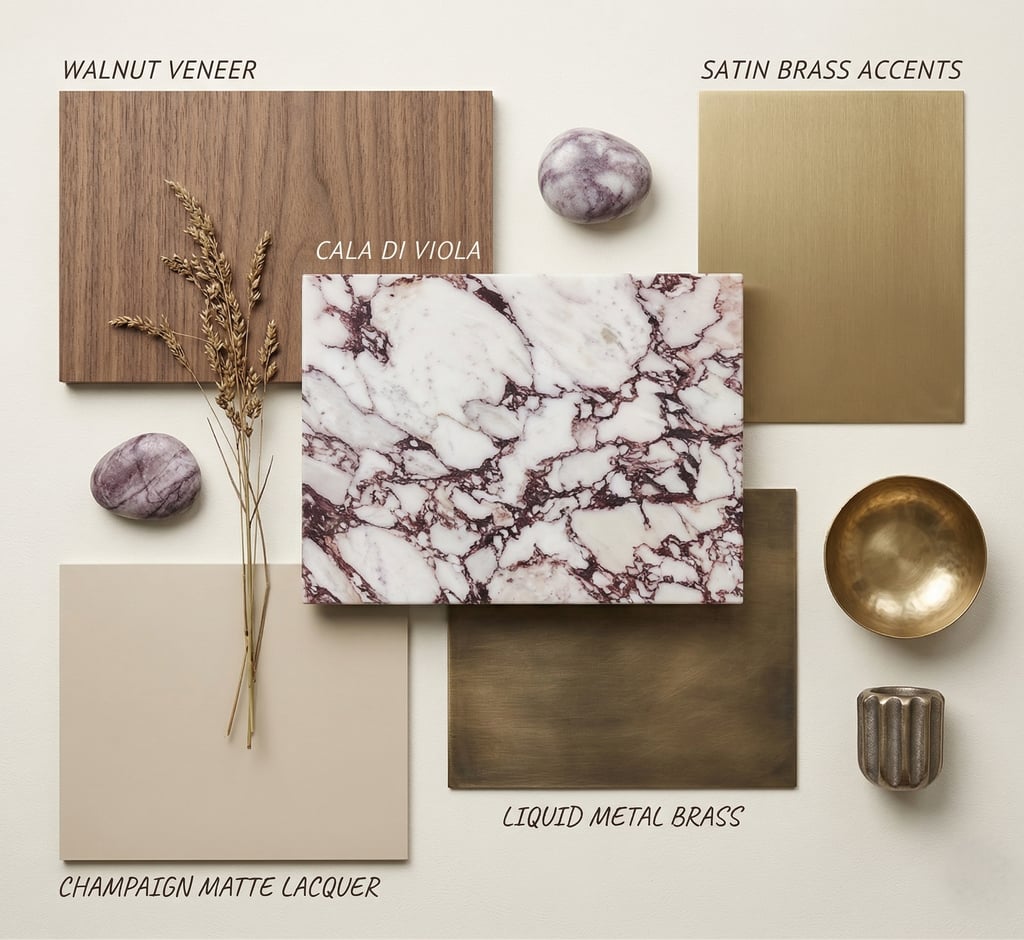 A meticulously curated palette where the dramatic veining of Calacatta Viola marble meets the warmth of hand-selected American Walnut. The composition is elevated by the artisanal touch of Liquid Metal Brass and the velvet softness of Champagne matte lacquer, creating a tactile experience of pure exclusivity.